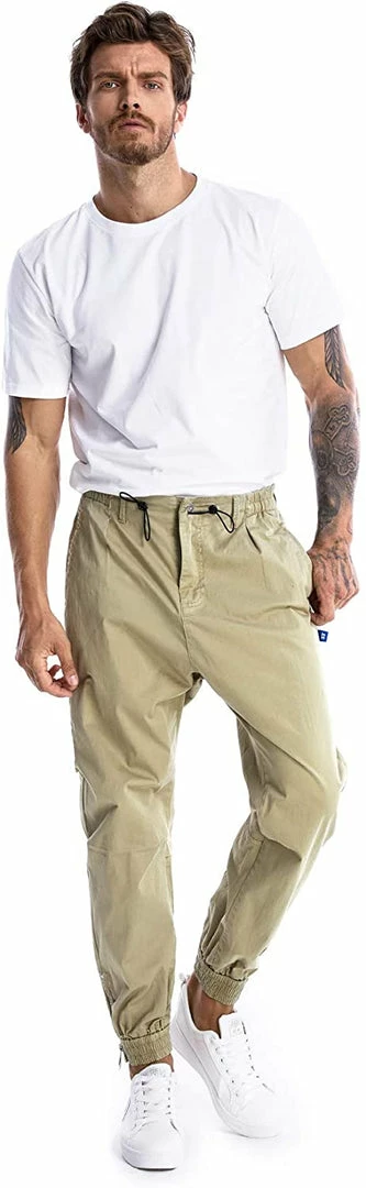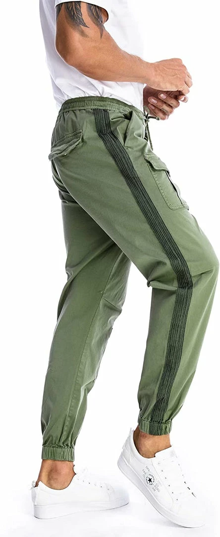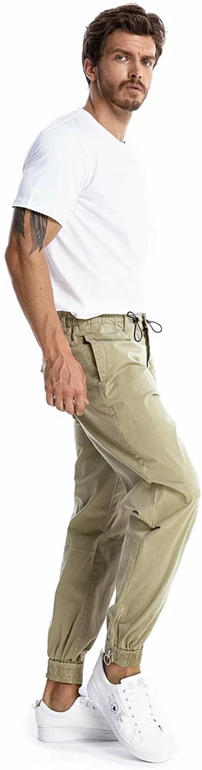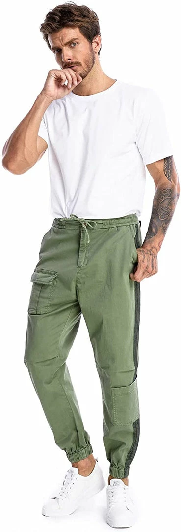 Mens chino cargo casual pants with slim fit relaxed styling.