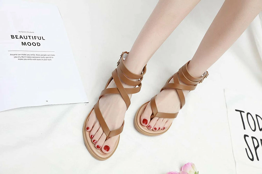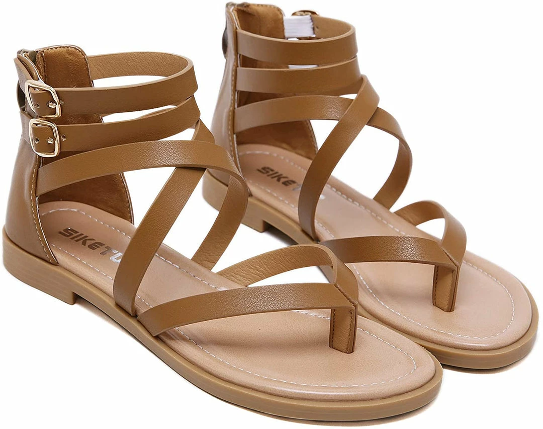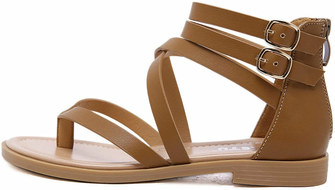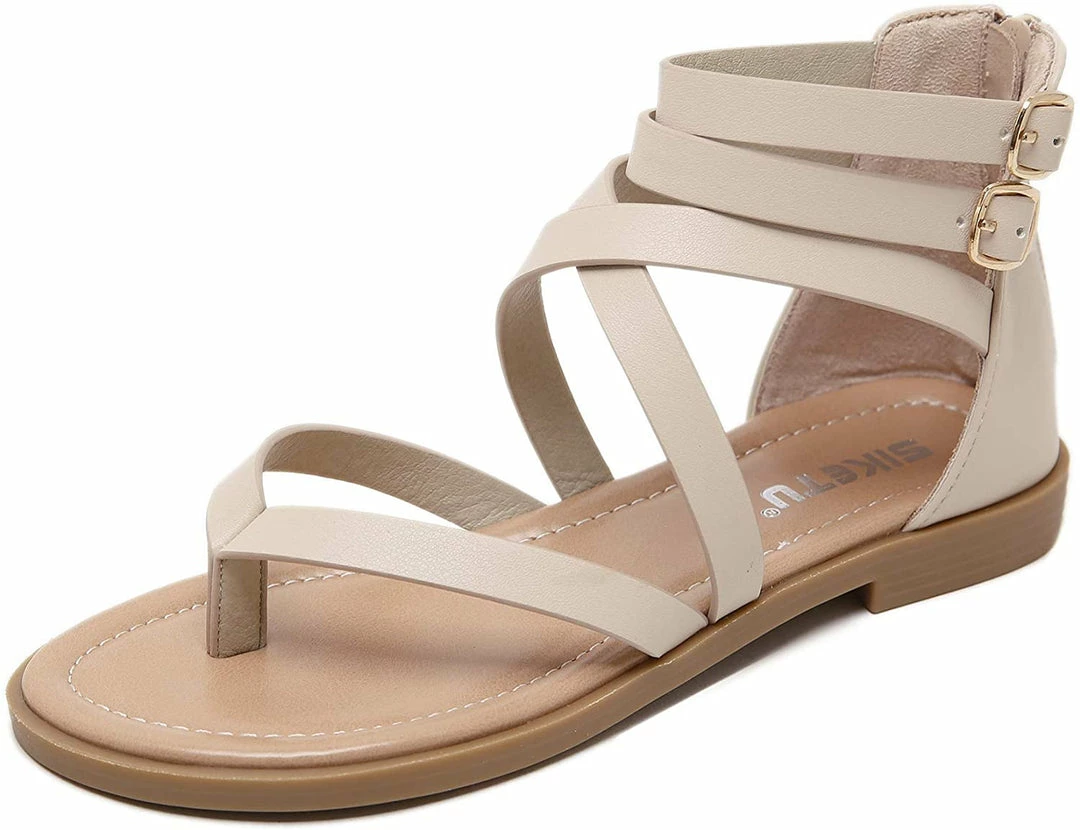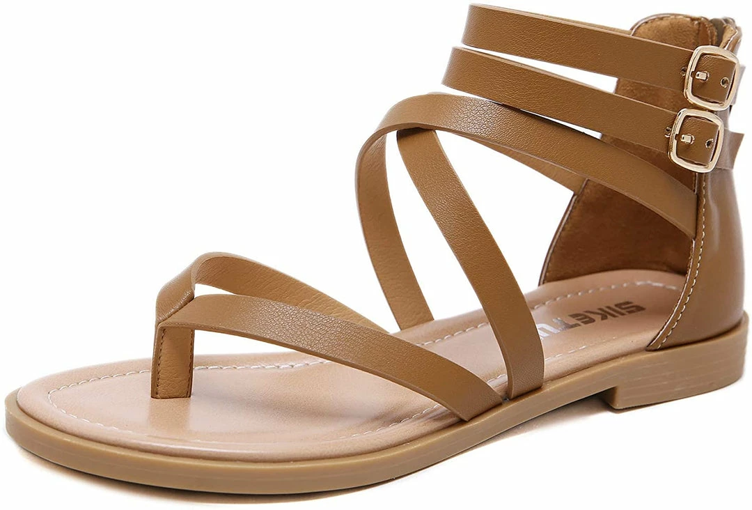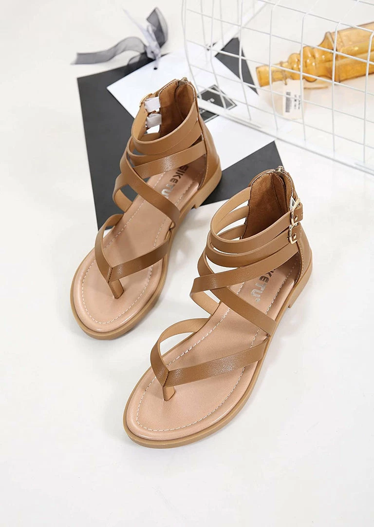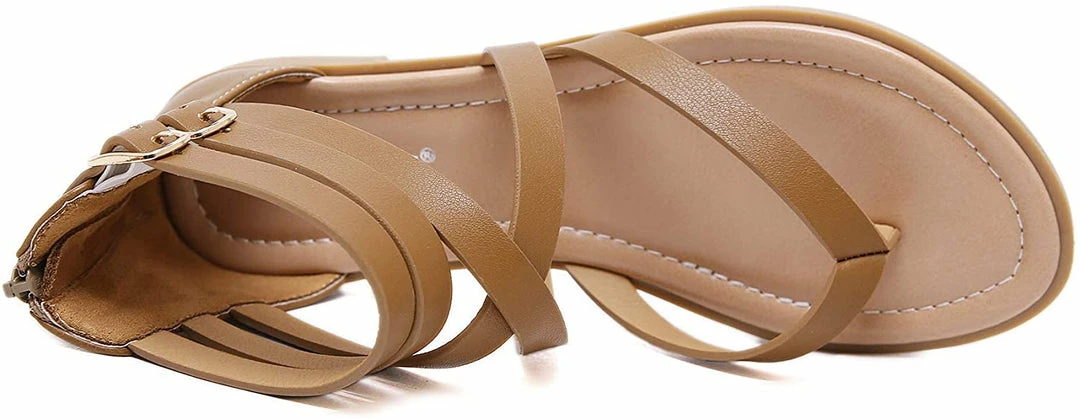 - Material: Artificial PU leather, comfortable Insole and non-slip rubber outsole women dressy sandals,Ankle strap sandals, thong toe crisscross strappy lattice flat sandal with low flat heel, zipper closure, lightweight sandals for women