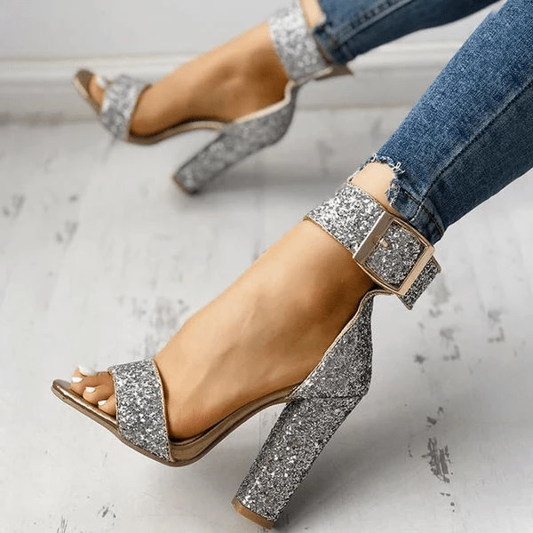 Nuheel® WOMENS Silver SANDALS PEEP TOE HEELS WITH SEQUIN SPARKLING GLITTER BUCKLE SHOES Heels Chunky Heel Party Pump Sandals Woman